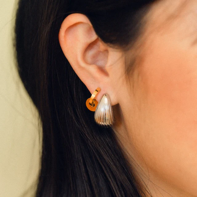 Model is wearing our Chunky Teardrop Stud (silver), Smooth Huggie (gold) and Disc Rounded Charm (thin).