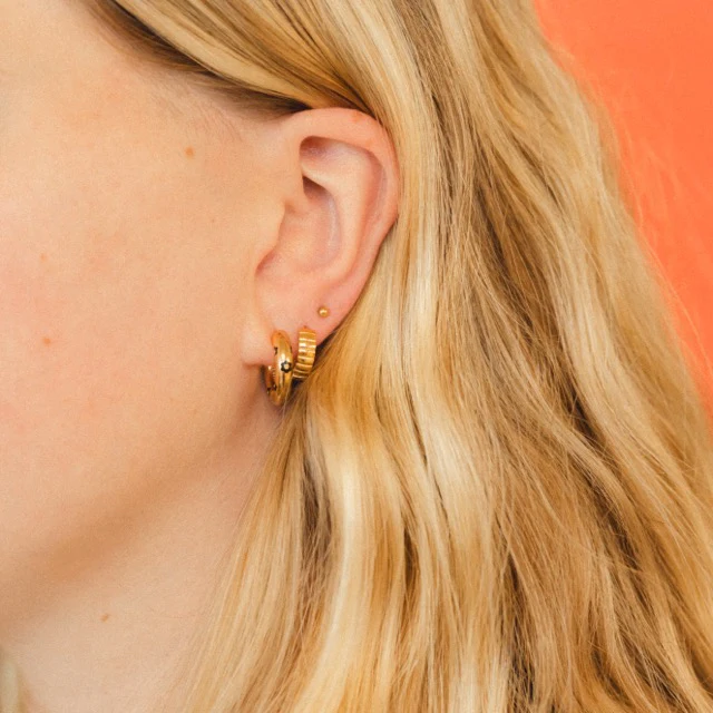 Model is wearing our Daisy Chunky Rounded (black/yellow), Scalloped Chunky Huggie (Gold) and Tiny Ball Stud (Gold).